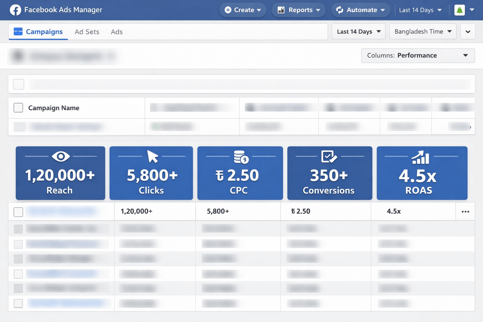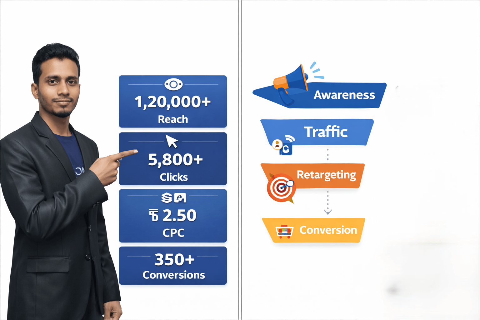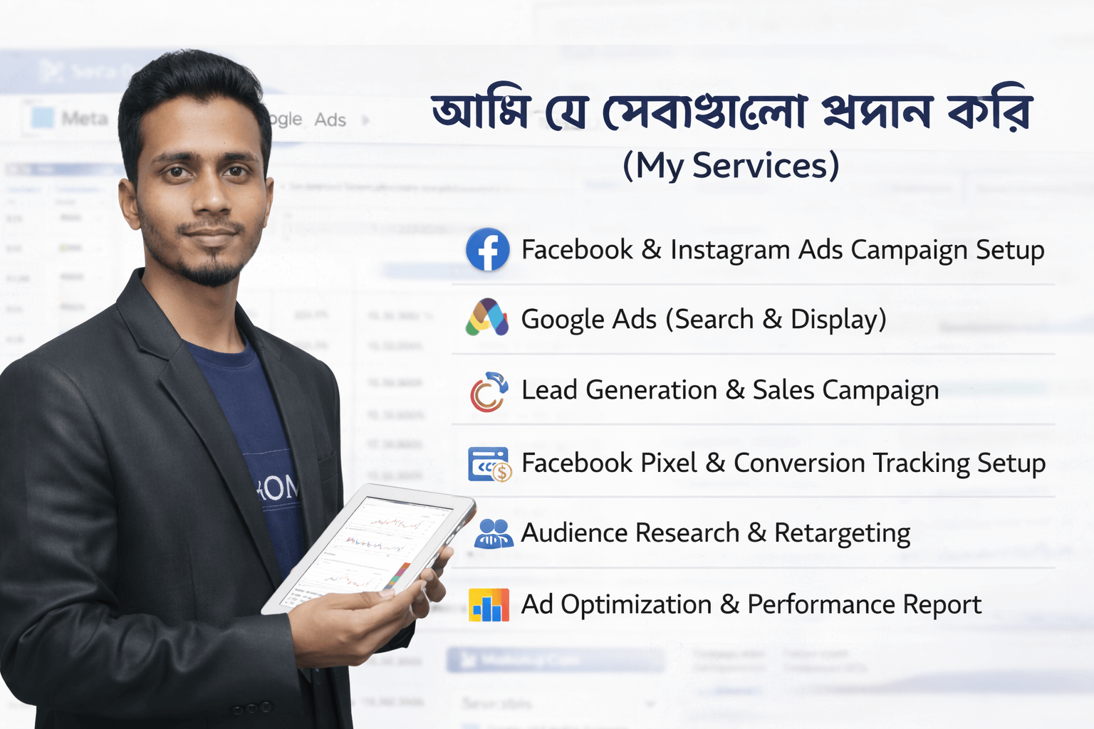 আমি Meta Ads ও Google Ads ব্যবহার করে E-commerce, Service-based ও Lead Generation Business-এর জন্য স্কেলযোগ্য মার্কেটিং সলিউশন প্রদান করি।